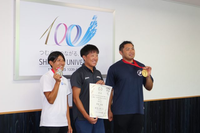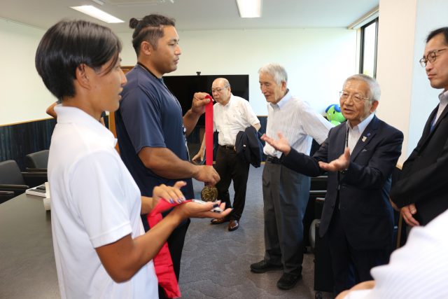 7月7日(月)に、幸長・木村両選手が中田恵陸監督とともに、佐藤理事長、松重学長への出場報告を行いました。メダルを手にした選手たちが本館応接室に入室すると集まった教職員一同から大きな拍手が起こり、お祝いの言葉と会見さながらの質問が次々に飛び出しました。両選手は、大会当時を振り返りつつ、トレーニングやコンディション調整の努力、今後の目標や意気込みを力強く語りました。中田監督からは記録の数字や競技映像には表れない、トップクラスの大会ならではの奥深い展開や選手たちの背景、指導者としての温かい思いのこもったメッセージが述べられ、話の間に何度も歓声が上がる賑やかな戦勝報告となりました。