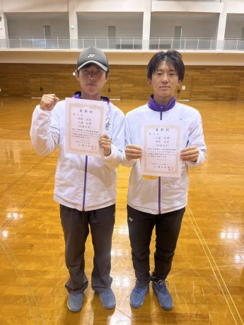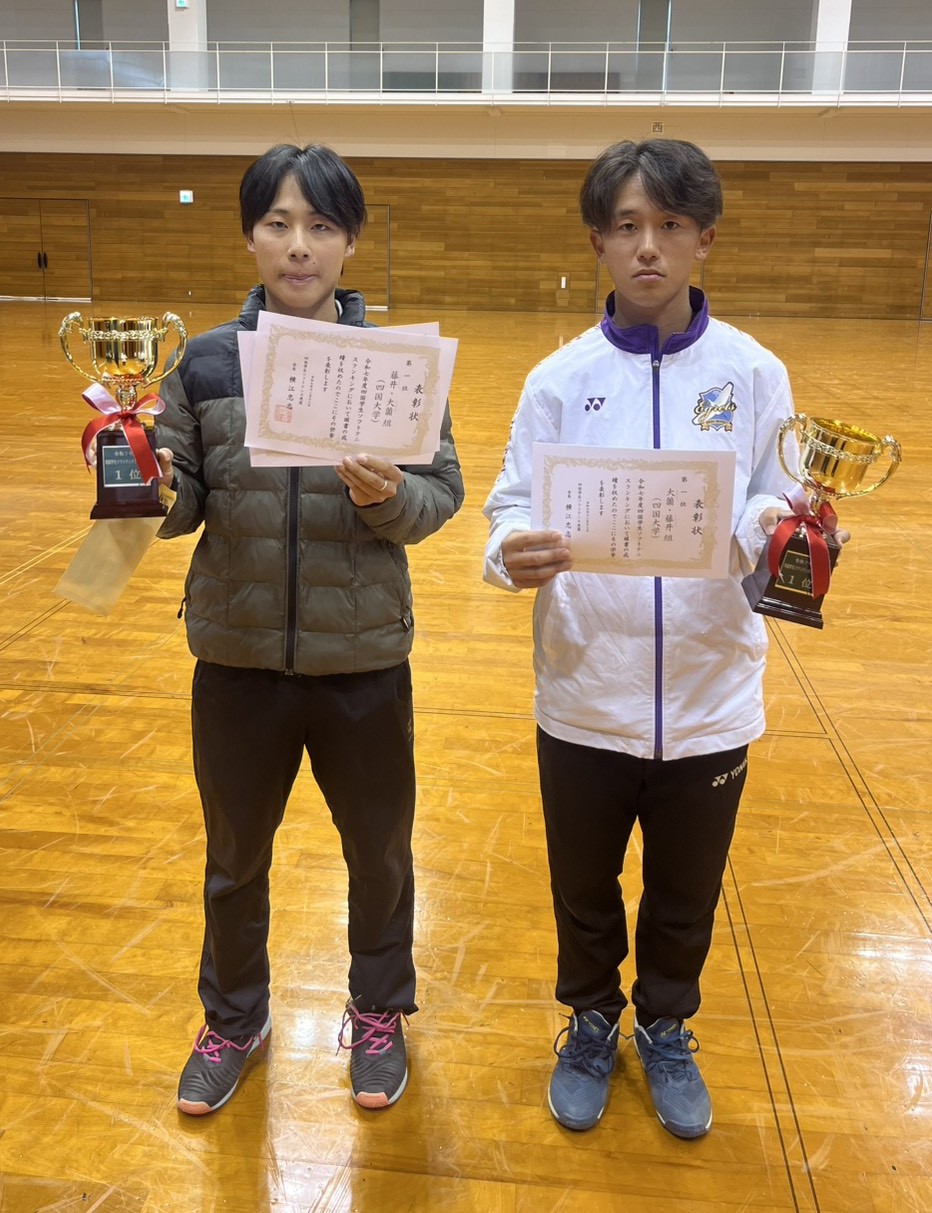 本大会は今年度四国学生ランキング1~12位までが出場できる大会で、本学からは4ペアが出場し、藤井・大薗(ともに経情3)、岡原・工藤(経情3・児童3)が3位でした。